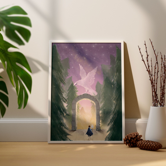 Plongez dans un monde de rêves et d’imagination avec cette affiche magique représentant la rencontre entre un petit sorcier et l’esprit corbeau gardien du portail magique.