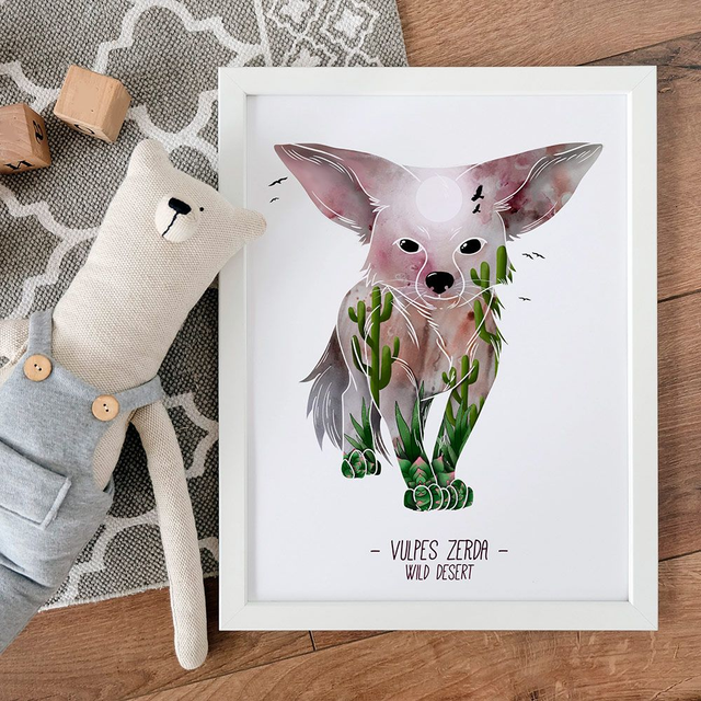 Impression d’une illustration numérique représentant un fennec dans son habitat naturel : le désert.